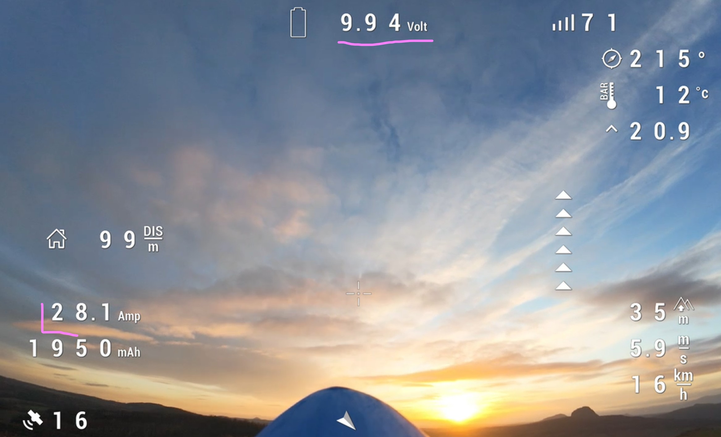 Doma jsem si posouval údaje v brýlích (OSD) dolů a teď zjišťuji, že ty nejvíc dole nevidím. Vůbec ten displej budu muset ještě nějak lépe nastavit, zatím mi to není úplně jasné. Ty podstatné údaje mi ale v brýlích zůstaly.