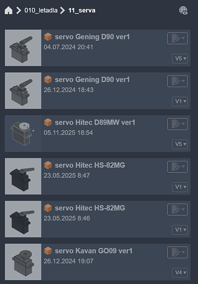 Aby to nebyla jedna nepøehledná hromada, mám to ve složkách. Mám složky pro serva, motory, akumulátory, koleèka, profily køídel ... prostì vše, co pøi modelování letadel používám.