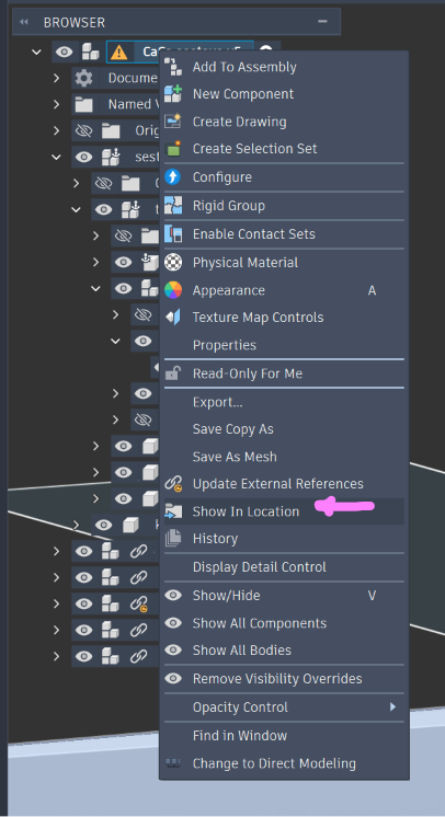 A jde to udìlat u jakéhokoli objektu vloženého do vaší sestavy! Kliknete na nìj pravým tlaèítkem myši a zvolíte Show In Location.