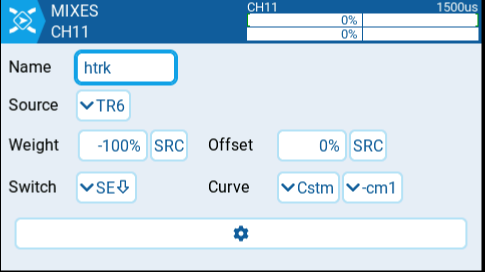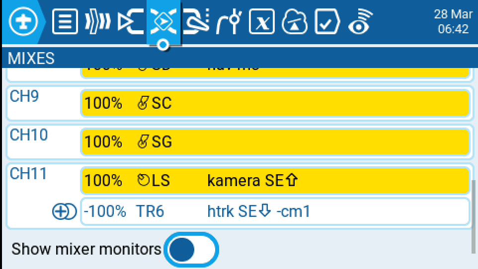 Kameru ovládám výstupem FC na kanále 11, mixuji v mixeru CH11 ovládání kamery sliderem SL a vstupem z headtrackeru TR6.