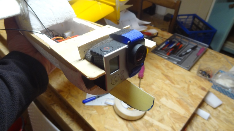 Na Betì teï vozím buï jednu kameru na špici modelu nebo dvì kamery souèasnì, na špici a v místì kabinky. Model má se dvìma kamerami letovou hmotnost 950 g. Protože s kamerou umístìnou úplnì na pøedku modelu jsem musel model dovažovat na ocase, rozhodl jsem se akumulátor pøesunout z kabinky pøed køídlem až pod centroplán mírnì cca do tìžištì. Díra pro akumulátor je delší než akumulátor a tak mohu baterku posouvat a tìžištì si doladit podle potøeby.