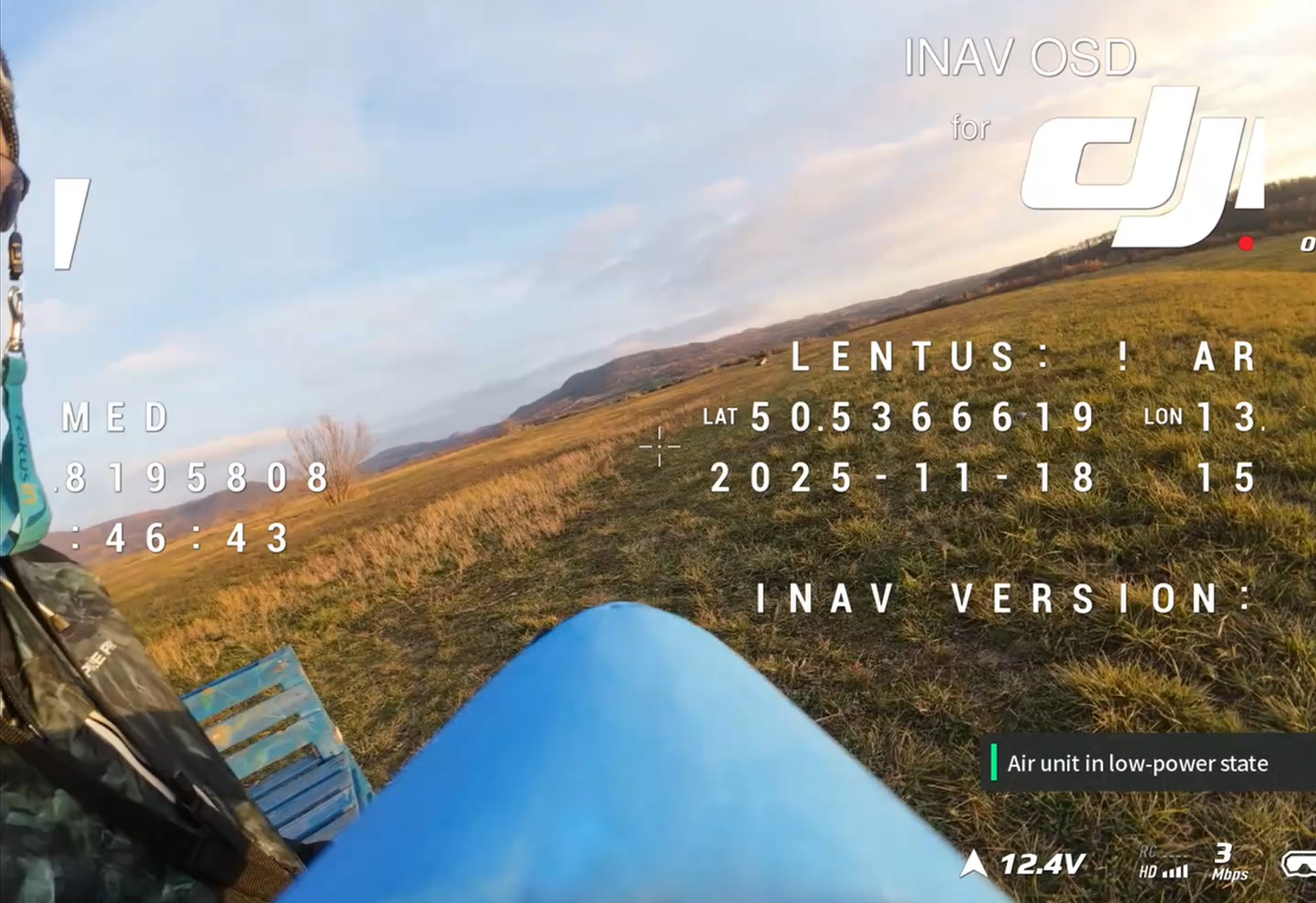 Doma jsem si posouval údaje v brýlích (OSD) dolů a teď zjišťuji, že ty nejvíc dole nevidím. Vůbec ten displej budu muset ještě nějak lépe nastavit, zatím mi to není úplně jasné. Ty podstatné údaje mi ale v brýlích zůstaly.