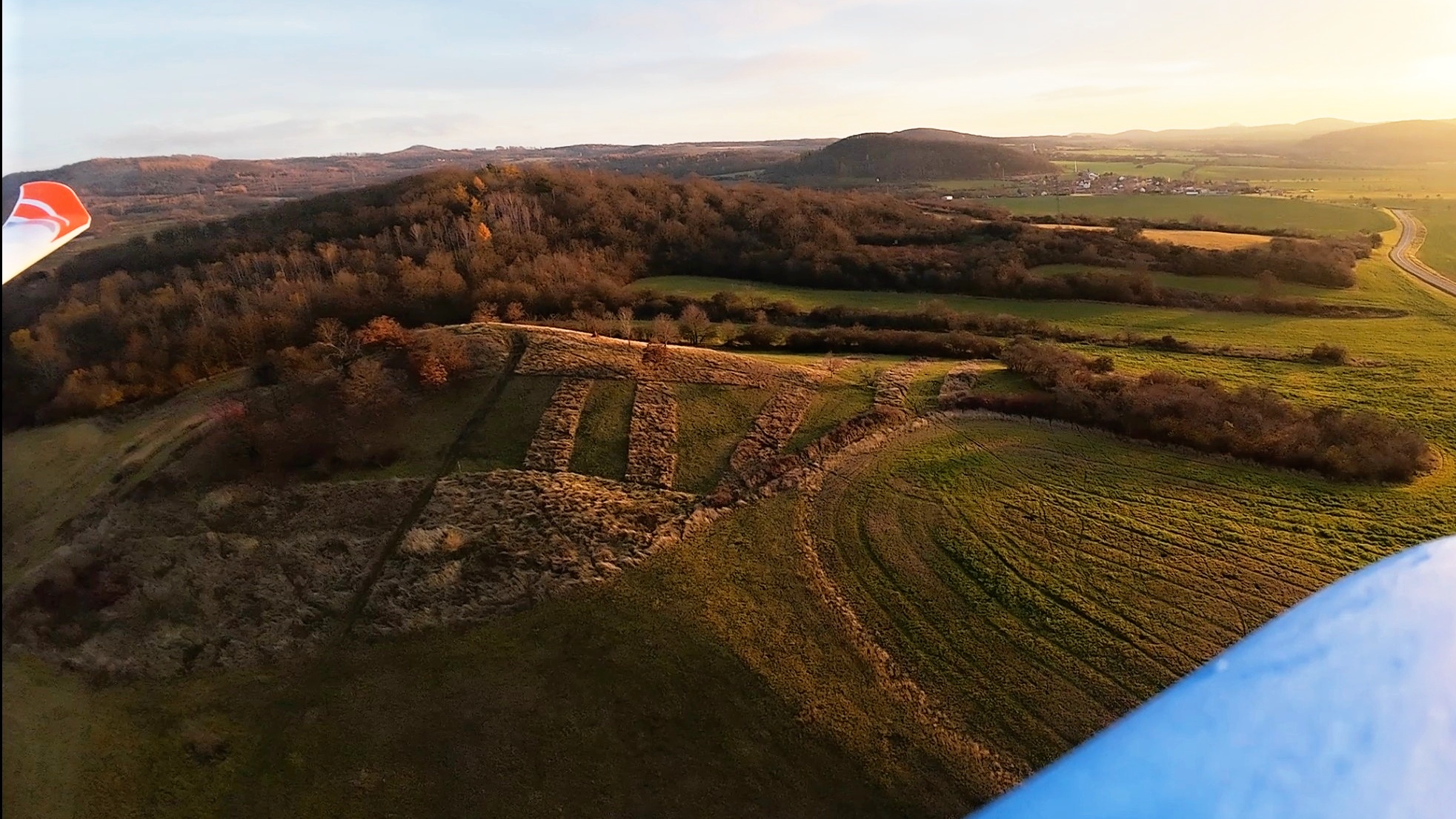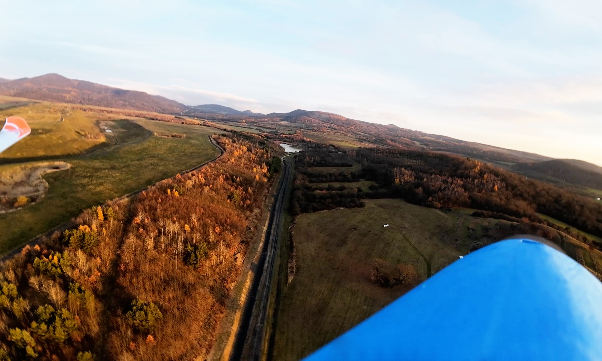 Zkouším to nejdříve na hraně malého svážku na kterém stojím. To se ukazuje docela těžké. Bez brýlí bych Lentuse v zatáčkách docela dojil, svah dává 0.5 až 1 m/s nahoru a je to na hraně. V brýlích se ale rychlost blbě kontroluje a v podstatě využívám toho, že mám s Lentusem nalétáno a vím, co si mohu v zatáčkách dovolit. A ukazuje se, že i odhad výšky je v širokoúhlém obrazu "nejednoduchý". Nějakou informaci dává, jak detailně vidím trávu ubíhající pod letadlem, ale jestli jsem tři nebo dva metry nad zemí nepoznám. A tady je to navíc snadnější, protože ten svah je jak podle pravítka (no on podle pravítka vlastně je 😃). Kopírovat terén někde, kde je to zvlněné, by byl dost risk.