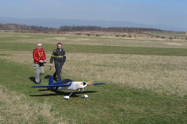 Vašek pøivezl na letištì plné auto letadel. Nejvìtší pozornost budí nový akrobat - 2.5 metrová Extra s dvouválcem DA 100 ccm. Prý budoucí vleèná.