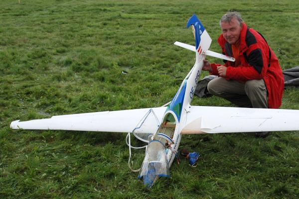 Byl jsem zrovna na zdech, kdy jsem zaal viset pod vlenou a tak jsem se vypnul. Otoil jsem se do normln polohy a najednou naplno potlaen vkovka a brutln obrcen plpemet. Otoil jsem se plvkrutem zase do normln polohy, ale za chvilku u zase la vkovka do potlaen. To u jsem val: "nedm". Model byl asi ve 400 - 450 metrech a tak 500 - 600 metr daleko po zemi. Prvn, co m napadlo, e nemm z njakho dvodu dosah. Zase to pelo plpemetem na zda s velkm nrstem rychlosti. To u m napadlo, e by mohlo jt o njak problm jen s vkovkou - panty nebo thlo a tak jsem chvilku letl na zdech. Potom jem to zase otoil kidlky do normln polohy a snail se lett k sob, abych byl bl kvli dosahu. Potom zase tvrd potlaen. Tak jsem radji letl na zdech a v cca 50 m se mi zdlo, e u to poslouch v delch intervalech (dosah? ruen?) a tak jsem to plvkrutem zase petoil do nornln polohy. A potom zase natlaen do stemhlavho letu. To u jsem vnmal vci na zemi a pmo pod letadlem stly na silnice podl letit dv auta a vedle nich lid. Vidl jsem, jak model let nkam do nich a hned jsem vdl, e tch 6 kg let alespo 150. Potom stet se zem, chvilku ticho a potom k nm doletla siln rna! Uvdomil jsem si zptn, e byl vidt i "rozprsk" modelu. Natst to padlo ne 200 m daleko, kde byla ta auta a ti lid, ale jet o dobrch 200 metr za nimi. Letit bylo zatopen vodou a pole, kterm jsem el bylo jedno velk bahno. Velik dra po pici trupu, ohl 16 mm ocelov kulatina v kdle, nic na modelu nen cel. Kdy jsme to donesli na letit, srotili se vichni a mudrovali. Padaly rady typu: "Nech si poslat trup, kabinu, kdlo ..." nebo: "Tohle v ppravku vylaminuje, sem foukne pnu, tady to vyzne, ..." (mon to pjde spravit. Zatm je to v pytli dole v dln zablcen).