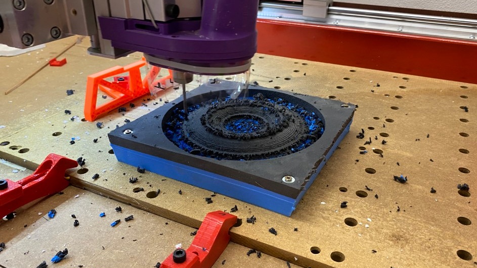 Pnu upnm pomoc roub do deva s podlokou, Sta tyi v rohu, sly vznikajc pi obrbn jsou mal. Obrbm do hloubky 2 mm nad stolem. Frzu s rovnm bitem nemm, pouil jsem jednobitou frzu se spirlou 3.175 mm.