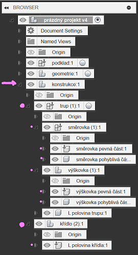 - konstrukce - Tady modeluji konstrukci modelu, přemýšlím na řešením jednotlivých detailů, použitím materiálů a zároveň vyrobitelností dílů. Pro jednotlive vyráběné díly zakládám samostatné komponenty (z více důvodů).