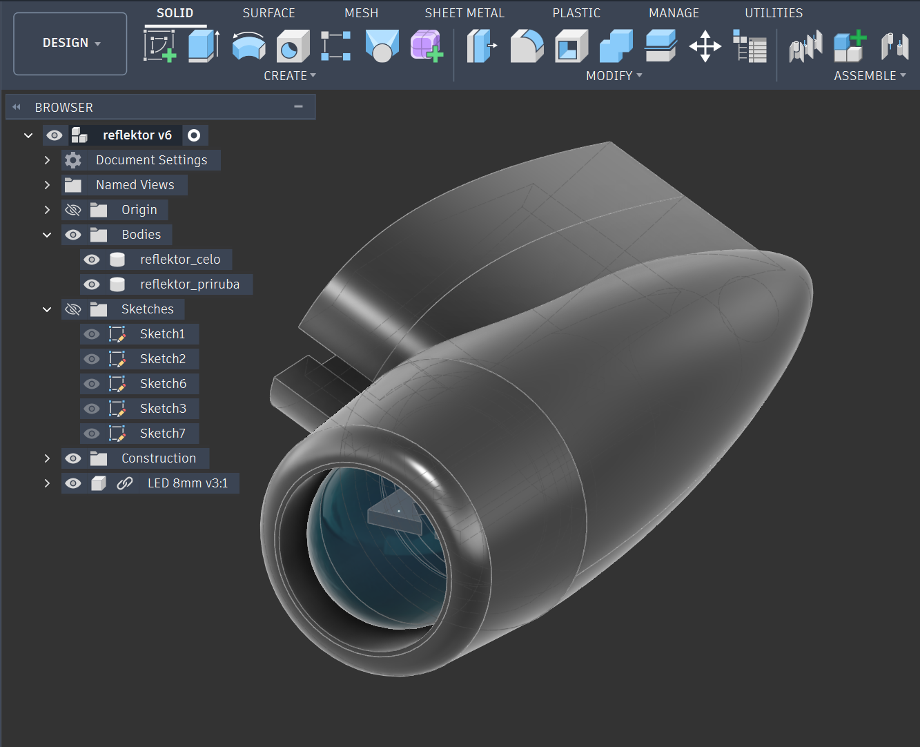 Vzal jsem Fusion a nakreslil model LED diody a k nìmu vymodeloval dvoudílný reflektor. Tisk z PETG. Modelování a pøemýšlení zabralo tak hodinu, tisk jednotky minut. Podstatné je, aby mìl èlovìk zkušenost s tolerancemi, aby šla do držáku zasunout LED a aby šly do sebe zasunout obì èásti reflektoru. Tisk dìlá ty díly o nìjakou desetinku vìtší.