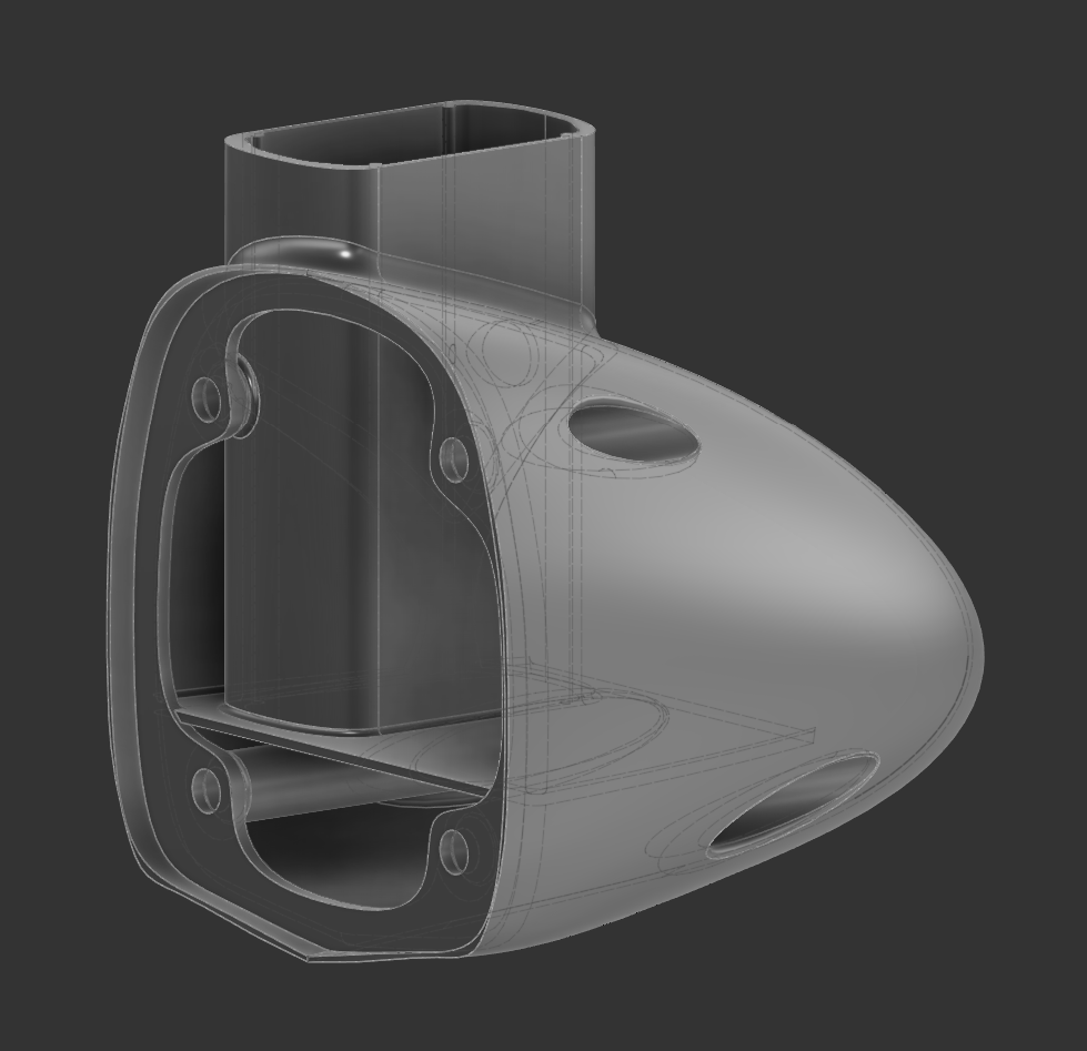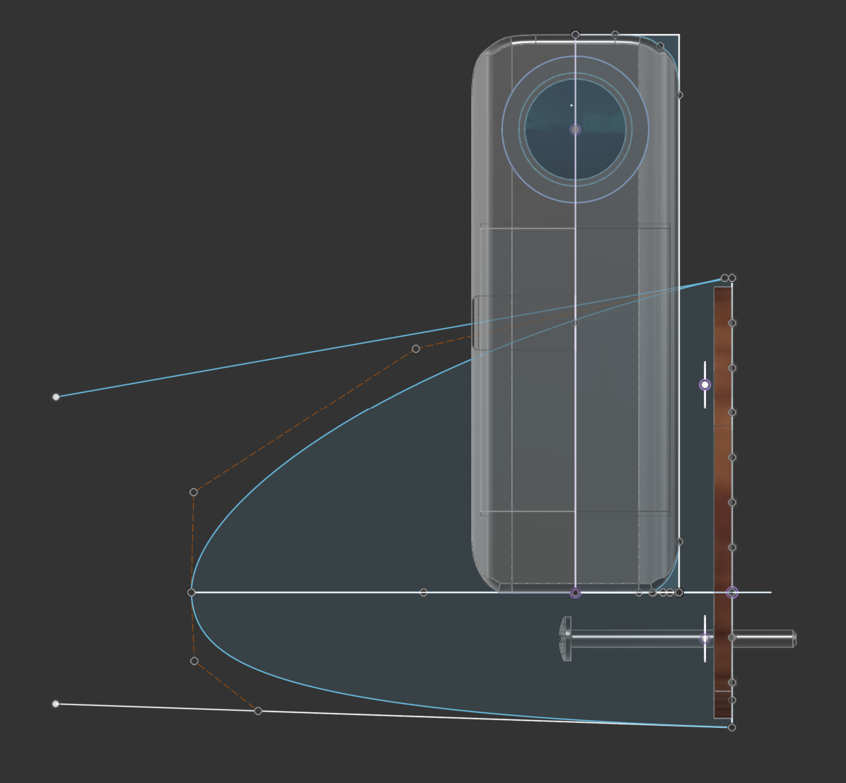Kameru jsem vymodelova v Autodesk Fusion a zkusil umístit na špici modelu. Kameru umístìná tak, aby mìla dobrý výhled, vadí kameøe za ní, kameøe pøes kterou model øídím. Nakonec jsem zvolil umístìní kamery nastojato s èoèkami míøícími do strany, kdy má kamera menší odpor, a posunutou trochu do strany, aby úplnì nebránila výhledu pøi øízení. Zkusím tuto variantu.