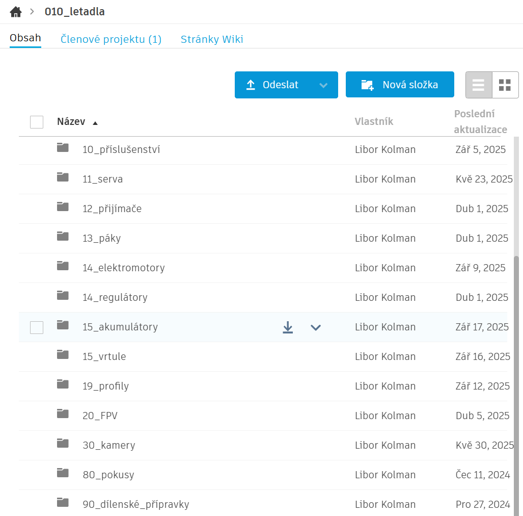 Komponenty, které se používají ve více modelech, jako jsou serva, motory, akumulátory, přijímače a podobně modeluji zvlášť a ukládám si je do složek mimo aktuální projekt.