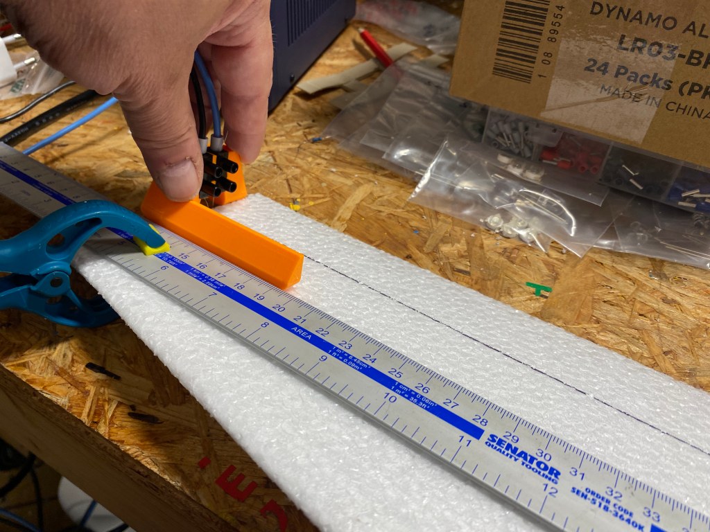 Přemýšlel jsem, jak to prakticky udělám. Vyzkoušel jsem různě tlusté odporové dráty, 0.6 mm už je dost tuhý, aby držel tvar. Otázka byla, jak vést řez pěkně rovně. Vymyslel jsem si a nakreslil držák, kterým jsem obestavěl čokoládu, ve které byl uchycený odporový drát a přívodní kablíky. Stačí potom naměřit distanc, svěrkami připevnit pravítko a projet křídlo po délce pantu. Vyzkoušel jsem si to na zmetku, který jsem si nechtěně vyrobil. Zbývá mi doladít, kolik materiálu má zůstat v pantu.