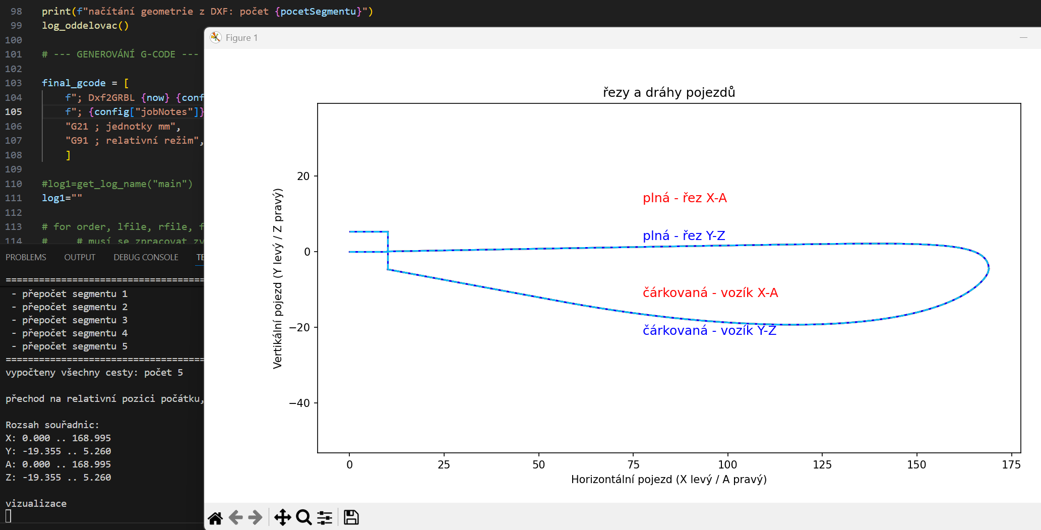 Tři dny usilovného vývoje a debugování. Narazil jsem na problém s orientací křivek v DXF, musel jsem se naučit otáčet je tak, aby na sebe koncové body a počáteční body navazovaly. Narazil jsem na problém s otočenými souřadnicemi. Řez profilem, který mám ve Fusionu orientovaný tak, jak chci aby byl orientovaný v řezačce, je po načtení z DXF otočený o 180 stupňů. Ale jen někdy. Musel jsem se naučit otočit to celé v programu. Narazil jsem na problém se společnými body sousedních křivek, které se v datech z Fusionu liší na 7. místě za desetinnou čárkou a mě se v programu jeví jako body různé. atd. atd. Naučil jsem se v Pythonu vyrábět debug výpisy, naučil jsem se operace nad maticemi s body, to vše s podporou AI, která mě zbavila nudného prohledávání referenčních manuálů. Je to jako když se něco učíte a vedle vás sedí senior, který zodpovídá vaše dotazy a ještě přidá nějaký komentář se souvislostmi, protože si pamatuje, na co jste se ptali předtím, včera, minulý týden. Ale musíte vědět, co chcete udělat.