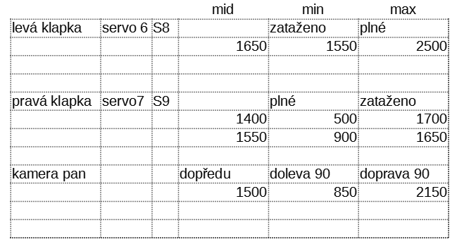 Tenhle obrázek ukazuje, jak to vypadá v INAVu v tabulce Servos. Není poznat co je co. Proto si dělám takovouto pomůcku: